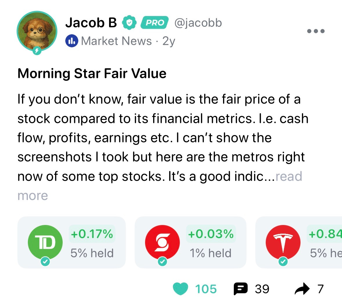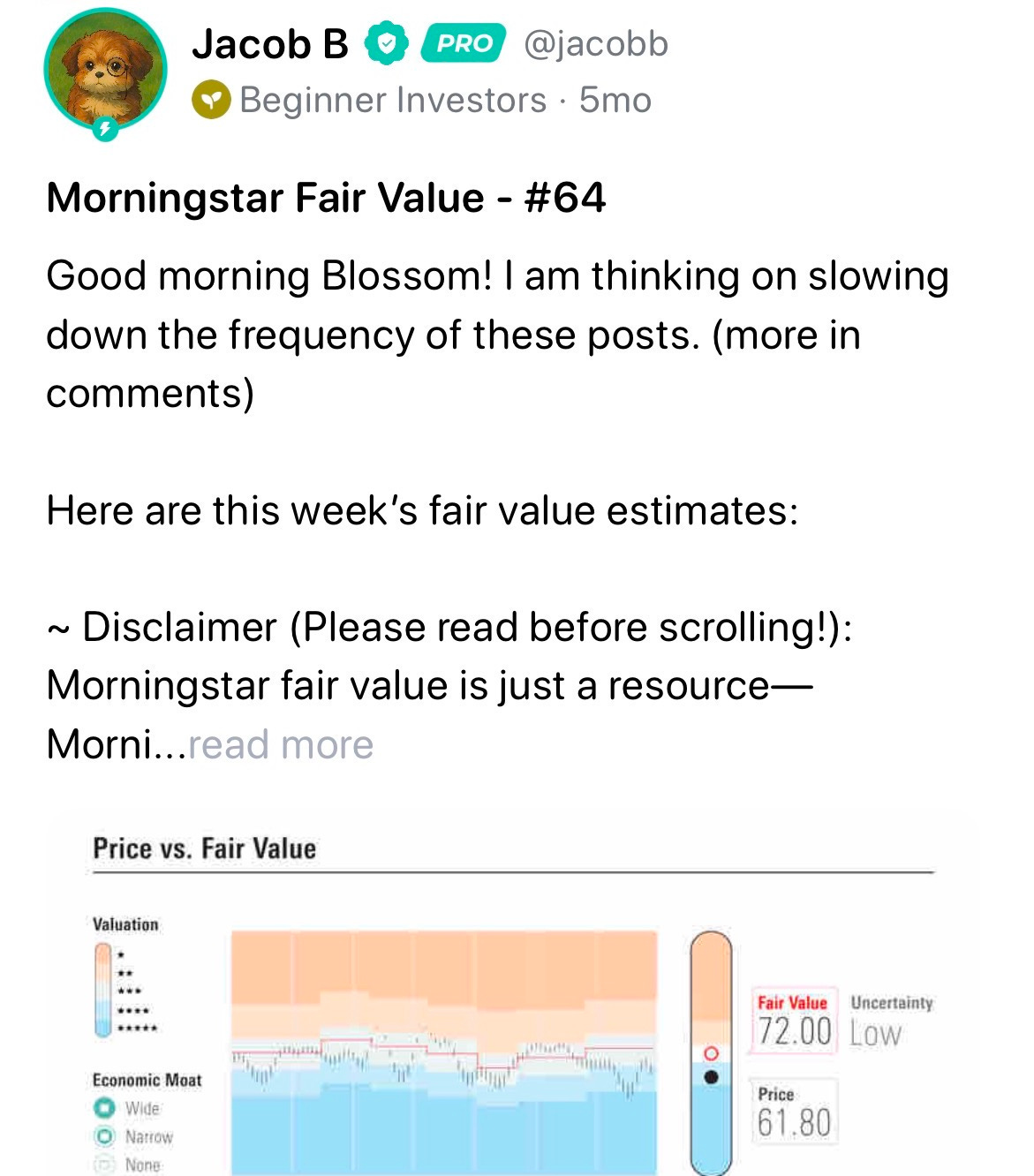 Only eight days after I joined Blossom, I shared a few lines of “Morningstar fair value estimates” that I came across after watching an Andrei Jikh video (another YouTuber). Morningstar is an investment research firm that publishes its own valuation of a stock’s fair price, using “proprietary” methods that factor in growth, competitive advantages, etc.
