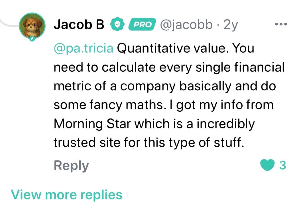 Over the course of these 64 weeks, my Morningstar posts would go on to receive North of 2,500 likes, hundreds of comments, and hundreds of thousands of views in aggregate. On a platform with only a few hundred thousand users, this was a huge achievement. People would come to these posts because it was something they couldn’t find themselves. They would write thank you, and I would be back again next Wednesday, at 9:30 EST sharp.