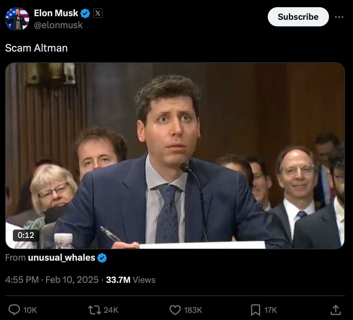 Sam Altman: I think he’s probably just trying to slow us down. He obviously is a competitor. You know, he’s working hard and he’s raised a lot of money for xAI, and they’re trying to compete with us from a technological perspective—getting the product into the market. I wish he would just compete by building a better product, but I think there’s been a lot of attacks—many lawsuits, all sorts of other crazy stuff, and now this. We’ll try to just put our head down and keep working.
