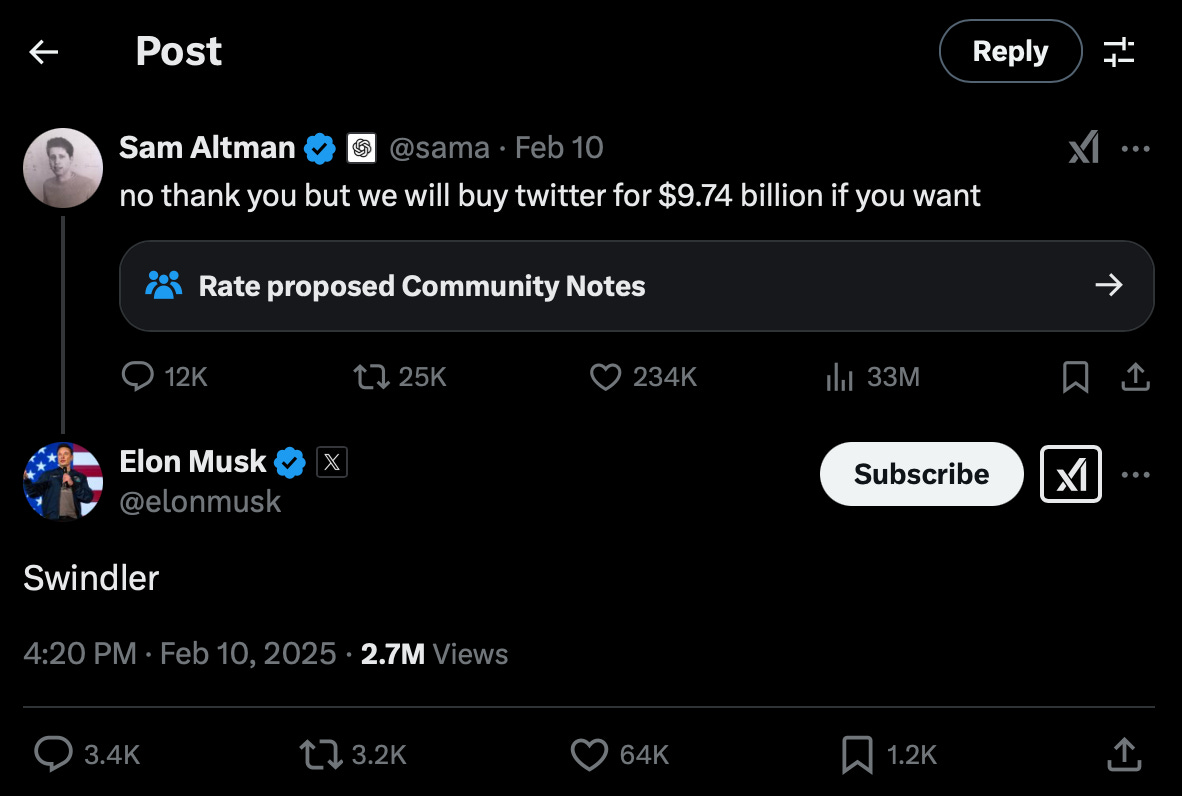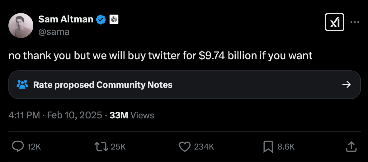 Right now, OpenAI’s for-profit needs to compensate the non-profit for its ownership stake in the for-profit, so that the non-profit doesn’t abandon its mission to benefit humanity and sell itself out to shareholders. This doesn’t even include Microsoft’s 49% profit share entitlement of OpenAI’s future profits, which further complicates things. (Ergo, the structure is weird.) The likelihood that Elon actually buys OpenAI is very low—never going to happen, that kind of low. Low single digits in odds. As I write this, the offer is still on the table. Musk’s lawyers have said that he will withdraw the bid if OpenAI abandons its plans to transition to a for-profit structure.
